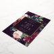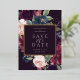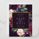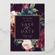 Our Plum Blossom wedding save the date frames your wedding details with an elegant square border of lush watercolor foliage and flowers in blush pink, burgundy plum purple and dusty blue, with real gold foil trim on a rich dark purple background.