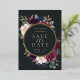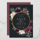 Our Plum Blossom wedding save the date frames your wedding details with an elegant square border of lush watercolor foliage and flowers in blush pink, burgundy plum purple and dark dusty blue, with real gold foil trim on a rich charcoal background.