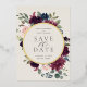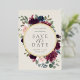 Our Plum Blossom wedding save the date frames your wedding details with an elegant square border of lush watercolor foliage and flowers in blush pink, burgundy plum purple and dark dusty blue, with real gold foil trim on a vintage ivory background.