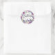 The sticker is made on wonderful paper and had no problem sticking to the bag that I purchased to put it on. I wanted to find a design that would be cute for the bride and groom and this one fit the bill as it has cute "bees" buzzing around and the wedding was taking place in a town called "Bee Cave". The packaging was great and protected the stickers. The website is easy to navigate and there are so many color choices. I had no problem finding a color that the bride was using on everything else selected. The design was adorable and there were many to choose from. You can make the figure as larger or smaller and you can place the photo and writting whereever you want to in the sticker. The printing is fabulous..better than expected.
