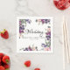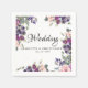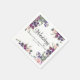 Blush pink roses and deep purple flowers create a beautiful frame on these personalised wedding napkins. Lots of greenery and leaves creates a modern and carefree Boho vibe. Wedding is written in a lovely flowing script. The wedding couple's names and wedding date follow in a classic serif font. Easy to customise template.