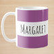 This personalised mug is designed to deliver a touch of individuality to your daily routine. The central feature of the design is a wide, customisable band that wraps around the mug, ready to be adorned with a name, rendered in a crisp, contemporary sans-serif font. The font's size makes a bold statement, ensuring the text is readable from across any room, making it a standout piece in any setting. The customisation feature on this mug makes it a perfect, thoughtful gift for friends, family, or colleagues for any occasion, be it birthdays, holidays, or professional milestones. It also serves as a charming addition to anyone's kitchenware, office desk, or as a keepsake for special events.In the spirit of personal expression, the mug is designed to be offered in a variety of colours. Regardless of the chosen hue, the design will maintain its distinct clarity and impact. The colours are selected to complement the clean lines of the text, ensuring that each personalisation stands out with elegance and simplicity. This mug is not just a drinkware item; it's a personal statement and a daily reminder of individuality and thoughtfulness. It is a blend of utility and personal expression, making it an essential item for anyone who values both practicality and a personalised touch in their daily lives.