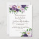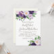 Beautiful plum purple and soft lavender watercolor floral and greenery on a botanical white wedding invitation. Contact us for help with customisation or matching products. The names of the bride and groom are in an elegant script font.