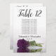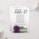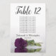 These beautiful table number cards will make it easy for your guests to find their seats at your wedding reception. They feature a simple yet elegant design with script calligraphy lettering and a single long-stemmed plum purple or eggplant colored rose lying on its side reflecting in water. The card includes a seating chart with 10 names. There is also space for the couple's names and wedding date. This card is available in a variety of sizes and is larger than our standard table number cards.