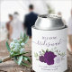 These beautiful wedding can coolers are a fun and thoughtful way to thank your bridesmaids. They feature a beautiful boho chic design with elegant script lettering and a cluster of hand painted watercolor roses, blossoms, eucalyptus leaves and greenery in shades of dusty purple, plum, and violet. The caption reads: Bridesmaid, with space for her name, as well as the names of the couple and wedding date below.