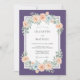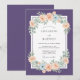 This design features a deep plum background paired with soft watercolor florals. Delicate peach roses and light blue anemones are nestled among muted sage green eucalyptus foliage. The romantic colour palette and elegant style create a sophisticated mood for a spring or summer event. Lush botanical elements provide a timeless aesthetic for a classic affair.