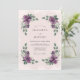Deep plum blossoms and soft lavender flowers are elegantly arranged with silvery-green eucalyptus leaves. A subtle blush watercolor backdrop enhances the romantic botanical aesthetic of this design. The palette of rich purple tones paired with sage foliage creates a sophisticated and timeless look for a spring or summer event.