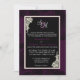 Elegant black and white lace over purple plum background with monogram and white contrast formal wedding invitation card.