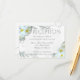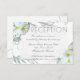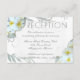 White wedding reception card enclosure is decorated with Hawaiian plumeria flowers of white and yellow. A leafy flourish surrounds the grey script text in three template areas, including the reception name and address.