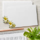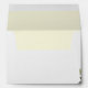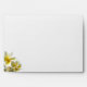 Plumeria flowers and gold flourish decorated envelopes for weddings and events. Light grey, linen paper is blank on the front except for a gold, leafy flourish along the left edge. The flap contains pretty white and yellow frangipani, or plumeria, flowers and a matching, smaller flourish. Include a return address on the flap with modern, handwritten script for names and printed text for address.