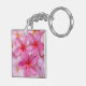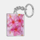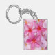 Acrylic keychain shown with a photo print of pretty tropical plumeria flowers located in the hawaiian islands.