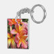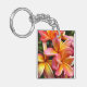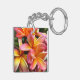 Acrylic keychain shown with a photo print of pretty tropical plumeria flowers located in the hawaiian islands.