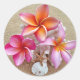 Sticker with plumeria, the Hawaiian flower, on shells on the beach Can be used for any occasion and matches Save the Date and Wedding Invitations and Cards.