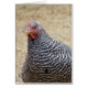A young hen with an alert gaze is captured while strolling through the straw in this photograph. She is a Plymouth Barred Rock a bit over four months of age.