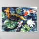 Brightly coloured fish swim through the waters of a garden pond, Nishikigoi (koi) are symbols of affection or love. Koi colourful and elegant swim beneath water lilies.Poster,print.