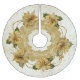 Christmas Tree skirt features elegant gold Poinsettia over gold bead design. Background is gold and white scroll pattern. Scalloped inner gold circle has Text saying Love * Joy * Peace
