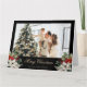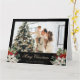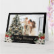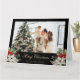 Elegant black photo Christmas card featuring white poinsettia, holly, berries and greenery.