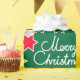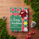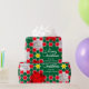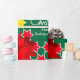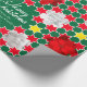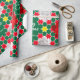 Bright Christmas family photos graphic wrapping gift paper in green, red, white and yellow with floral poinsettia bracts. Customise with your own two special family photos, family name or message. Currently reads Merry Christmas from the Rodríguez Family. Uniquely designed by Sarah Trett.