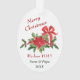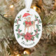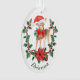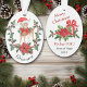 Here's a cute Holiday ornament for a grandparent or parent to give to a child, especially a little girl. The front of the ornament has an adorable deer fawn wearing a red and white Santa hat and red bow. The fawn stands behind a pretty poinsettia and holly wreath. Your child's name is in matching green in curved text at the bottom. The back of the ornament has a matching poinsettia bouquet in front of a gift package, and 4 text fields for your custom message. Easy to customise, and it makes a wonderful keepsake.
