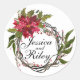 Add your names, initials or monogram to this Christmas holiday round sticker that features a colourful wreath of Poinsettia flowers, leaves and berries. Matching wedding invitations, envelopes, RSVP cards, save the dates and more are available! For questions or requests featuring this design, contact me: cheryl@cheryldanielsart.com. "Poinsettia Wreath" by Cheryl Daniels © 2017.