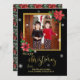 This elegant Christmas card has a template, framed in gold, for you to upload your favourite family photo. On two corners are arrangements of poinsettias, greenery and red berries. A red cardinal is perched on the bottom left arrangement. There are white snowflakes scattered about. Merry Christmas is written in gold foil and you personalise the card below that with your last name and first names. The reverse side of the card has a beautiful pattern of red poinsettias, greenery and red berries too.