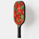 This pickleball paddle has a Christmas design of poinsettias scattered around on a field of green stripes.