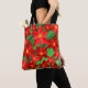 This tote bag has a Christmas design of poinsettias scattered around on a field of green stripes.