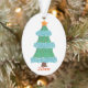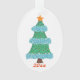 You can customise both sides of these decorative pointillism Christmas trees with the current year. This green tree is decorated with red and blue balls, blue garland, and a yellow orange star.