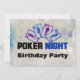 A birthday party invitation with a poker night theme. A set of 4 card with sexy girls and guys in silhouettes of blue and purple. Set on a weathered grunge style background. The backside of the card has your party details layered over top a faint image with some poker chips and cards.