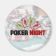 A magnet with poker night typography. Background is a faint image with poker chips and playing cards on a green gaming table. Layered over top is a set of 4 cards with boy and girl silhouettes with the text: Poker Night. Written in big bold letters.