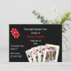 Bachelor party invitation done in black and red with a poker theme. Graphics of red poker chips and playing cards decorate the black invitation. Personalise all the text for your bachelor party.