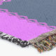 A quality printed throw has its advantages. This is a much finer weave throw than its loopier cousins, and though lighter, it is worth the investment for custom room accessorizing. The back is much prettier than the typical brown, and the fringe on the long sides very vivid, the selvage nicely done. Before photographing, I washed the throw in cold water, delicate, with a thicker woven throw the same size. On tumble dry low, this throw was dry in half the time as the other. This is a very practical quality if you use throws for furniture covers or to wrap up in frequently. The sleekness of the fabric makes it a great layer for accenting or protecting without the feeling of sitting on too much stuff. Perfect for napping or when you feel a light chill coming on. The color printing is beautiful and on this fabric, matched the design and color of my Photoshop image. This is an advantage for blending room fabrics and colors. The fringe on the short sides prints the colors from the design image and therefore varies from the side fringe. I streaked a white fractal line through the plaid pattern to give the illusion of weaving. This printed as crisp as an illusory thread, and put some white in the short side fringe, showing another advantage of print vs loomed- for artistic purposes, line lines, detail, and color integrity can be planned and preserved. My loomed throws have color limitations and more of a needlepoint texture. Print throws reproduce an exact image. The throw felt a little stiff straight out of the package, but this went away in the first delicate wash. Of course I searched the wash water for ink or bleeding and there was none.