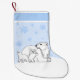 Celebrate family warmth this winter with a darling polar bear mom and her two cubs on a snowy mound under softly falling snowflakes. This sweet cartoon design features an icy blue background and customizable name banner, with matching half-drop snowflake pattern on the back. Perfect for shoppers and holiday decorators who love heartwarming, personalized Christmas stockings with a touch of Arctic charm.