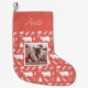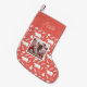 This cute and modern christmas stocking features a name and your photo with patterns of a polar bear, pine leaves, poinsettias, holly leaves, and berries on red background. Personalise it for your needs. You can find matching products at my store.