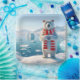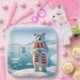 A polar bear wearing a red and white striped scarf stands on an icy landscape, holding its paws in the shape of a heart