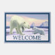 Features a digital painting of a polar bear cub seeking reassurance from its mother on the Arctic ice pack. Text reading, "WELCOME" also appears.