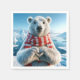 A polar bear is wearing a red and white striped scarf forming a heart shape with its paws
