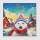 A Polar Bear wearing a Santa hat and scarf with falling snow. Merry Christmas greeting.