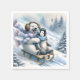 A polar bear and a penguin are joyfully sledding down a snowy hill, bundled up in cosy scarves and earmuffs