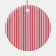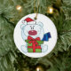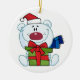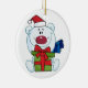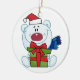 An adorable smiling polar bear with a red stocking cap holds a holiday gift and a red and white stripe background adorns the back of this colourful keepsake holiday ornament!