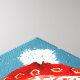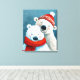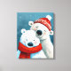 This image features two polar bears in a heartwarming embrace, set against a snowy, teal-toned background. The larger bear wears a red knit hat, decorated with subtle patterns, while the smaller bear is wrapped in a bright red scarf. Both bears have soft, rosy cheeks and serene expressions, creating a cosy and affectionate winter atmosphere. The textured, painterly style enhances the warmth and charm of the scene.