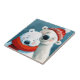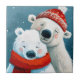 This image features two polar bears in a heartwarming embrace, set against a snowy, teal-toned background. The larger bear wears a red knit hat, decorated with subtle patterns, while the smaller bear is wrapped in a bright red scarf. Both bears have soft, rosy cheeks and serene expressions, creating a cosy and affectionate winter atmosphere. The textured, painterly style enhances the warmth and charm of the scene.