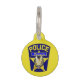 This custom dog tag is decorated on one side with a police badge and with a place for the dog's name, and on the other with contact information.