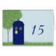 Quirky and fun Police Box Wedding Table Number Card featuring a brilliant blue vintage police box in a pretty field with a tree in the background. Easy to customise, simply add the text of your choosing in the text fields provided. Click "Customise It" to find more personalisation options.