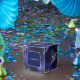 Iconic police box design on a galaxy background.
