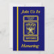 This blue and gold invitation is decorated on the front with a Police Chief's custom badge logo. You can customise this card by placing your information into the boxes provided. You can also customise the badge on the front and back with the honoree's name.
