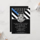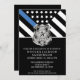 This design features a police force flag with black and white stripes, and a thin blue line stripe as well. The police badge and silver text sits above all of the party details for the retiring law enforcement officer, sheriff, captain, or chiefs retirement party details.