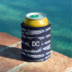 Fun navy blue can cooler printed with stripes of white crime scene police line - do not cross tape, with monogram text areas on the front and back to add your own initials. Perfect for police officer birthday BBQs and retirements parties