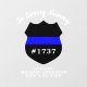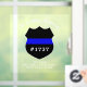 Honour your beloved police officer and with this Thin Blue Line Police Memorial window decal in a black and blue badge design in police flag colours. Personalise with your officer's name, badge #, and EOW date. This thin blue line police memorial window sticker will be a treasured keepsake to honour a fallen police officer or law enforcement officer. Perfect for police departments to honour a fallen officer. COPYRIGHT © 2020 Judy Burrows, Black Dog Art - All Rights Reserved. Police Officer Memorial Badge In Loving Memory Window Cling