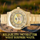 Police officer potato character with a blue police hat with a gold badge on it. With the words best Dad in the world above him. And a gold foil texture background design.